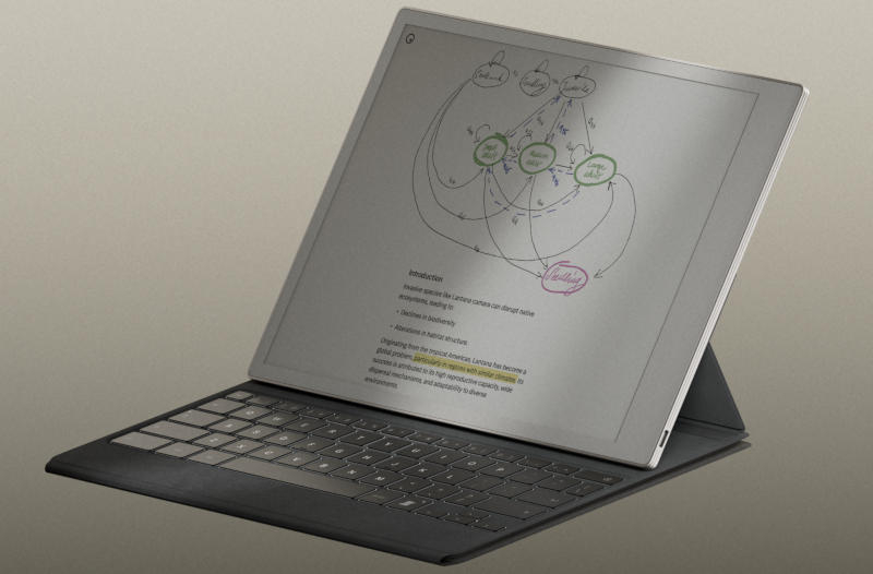 Дисплей E Ink Gallery 3 является, конечно, главной отличительной особенностью устройства — его диагональ составляет 11,8 дюйма при разрешении 2160 × 1620 пикселей (соотношение сторон 4:3), предусмотрена встроенная подсветка. Устройство работает на базе 4-ядерного процессора Arm Cortex-A53 с тактовой частотой 1,8 ГГц; объем оперативной памяти LPDDR4 составляет 2 Гбайт; есть встроенный накопитель ёмкостью 64 Гбайт. Для связи с внешним миром используются модуль Wi-Fi (2,4 и 5 ГГц) и порт USB Type-C — через него заряжается аккумулятор ёмкостью 5030 мА·ч, которого, как утверждает производитель, хватит на две недели автономной работы.